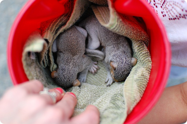 Oh, and did I mention the squirrels were loaded with fleas? Yeah, I couldn’t stop itching last night after we rigged up a Ziploc bag full of warm water to warm them up and then situated them safely in the chicken coop under a heat lamp (protected from the chickens). I had to put my clothes straight in the washer and get in the shower and wash the creepy crawlies off me! Sick!